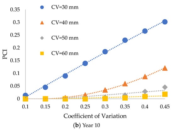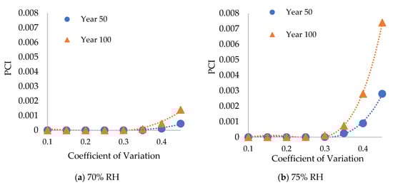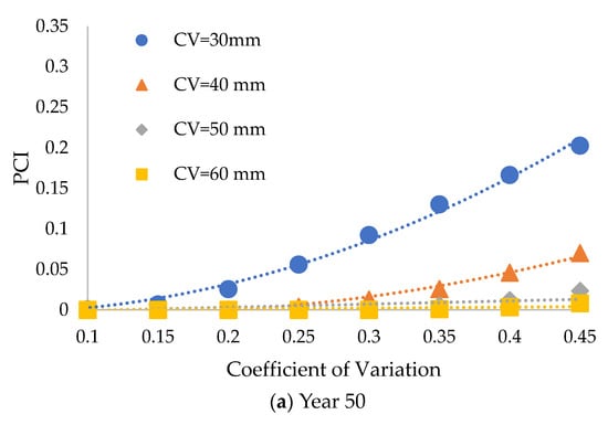 By varying the variation coefficient of the concrete cover depth only (keeping the other parameters the same as those mentioned in Table 2) in the sensitivity analysis, its impact on the corrosion probability at 50 and 100 years is evaluated via the MCS, as described in Section 2.2., as shown in Figure 10. Figure 10 shows a sharp increase in the PCI, especially for concrete cover depths of 30 mm and 40 mm, when the coefficient of variation of the concrete cover depth varies from 10% to 45% in year 50 and year 100. However, the PCI values are almost constant and equal to zero and show negligible increases in the PCI for the concrete cover depths of 50 mm and 60 mm across various coefficients of variation ranging from 10% to 45% of the concrete cover depths of 50 mm and 60 mm in years 50 and 100, as shown in Figure 10. Furthermore, it was deduced that the use of concrete cover depths of 30 mm and 40 mm for RC bridge decks made of GPC consisting of 50% FA and 50% SG would lead to a high PCI in future years. Therefore, concrete covers greater than 50 mm are recommended for RC bridge decks made of GPC (50% FA and 50% SG), which leads to a low PCI due to the impact of climate change in various future years.