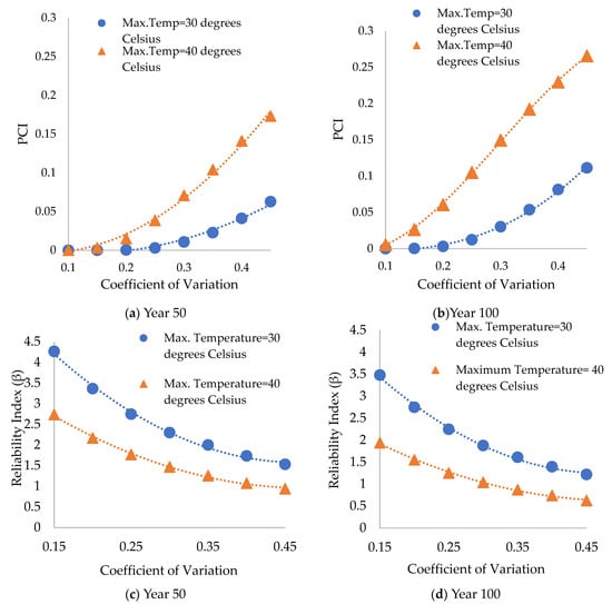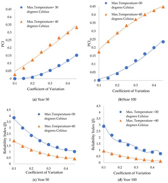 - Polynomial equations: This study provides polynomial equations for predicting the PCI and reliability index (RI) across various coefficients of variation for concrete covers of 40 mm and 50 mm at different maximum temperatures. These equations serve as valuable tools for assessing the risk of chloride-induced corrosion under various climate conditions.