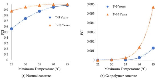 - Relative humidity impact: The influence of relative humidity on the PCI is negligible compared with the significant impact of the maximum temperature. RH values of 70% and 75% have minimal effects on the PCI for a concrete cover of 50 mm.
