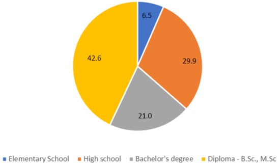 In the sample, 63.6% of respondents have a university education (diploma or bachelor’s degree), 29.9% have a high school education and 6.5% completed elementary (or primary) education only (Figure 3). The level of education is an important predictive factor when analyzing adherence to a gluten-free diet. Previous research points to the fact that consumers with a higher level of education have a higher rate of adherence to a gluten-free diet [22].
