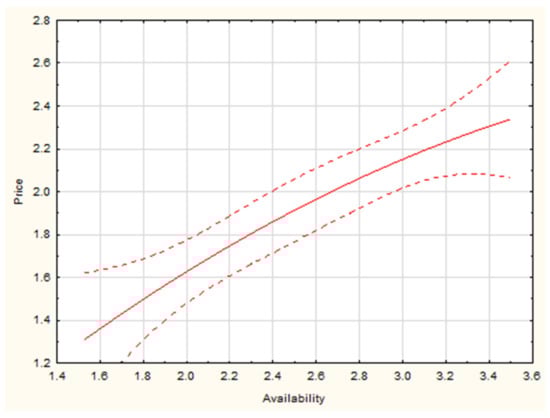 The dependence of the product price on product availability is shown in Figure 4. The regression analysis presented in Figure 4 indicates a positive correlation, showing that as the availability of a certain group of gluten-free products increases, their price tends to rise. Notably, the confidence intervals widen at higher levels of availability, suggesting greater uncertainty or variability in pricing as availability increases. This trend might reflect the complexities of the market dynamics for gluten-free products, where increased availability could lead to diverse pricing strategies, possibly influenced by factors such as consumer demand, production costs, and market competition. As availability increases, this could indicate that the market is expanding beyond niche consumer groups to a broader audience, allowing producers to charge premium prices. Consumers may perceive greater availability as an assurance of quality or specialty status, justifying higher prices. Additionally, the higher prices could be due to the increased costs associated with ensuring the gluten-free status of products, which may include specialized production processes, the sourcing of certified ingredients, and rigorous testing, all of which contribute to higher prices, even as availability grows. The observed relationship highlights the need for the careful consideration of availability in pricing strategies to ensure market competitiveness while meeting consumer needs.