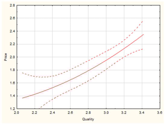 The dependence of perceived quality (organoleptic properties) on satisfaction with product price is shown in Figure 5. The non-linear regression analysis with confidence intervals presented in Figure 5 illustrates the relationship between perceived quality, measured through organoleptic properties, and consumer satisfaction with product price. The central solid line represents the main trend, indicating a positive correlation: as perceived quality increases, so does satisfaction with the price. The dashed lines around the main trend represent confidence intervals, suggesting a range of variability in this relationship. The widening of these intervals at higher levels of quality implies increasing uncertainty or variability in consumer satisfaction as the quality improves. This pattern may suggest that while a higher quality of gluten-free products generally leads to better sensory properties and greater satisfaction, individual consumer responses can vary more widely, possibly due to differing expectations or price sensitivity. This finding underscores the importance of balancing quality enhancements with price adjustments to maximize consumer satisfaction.