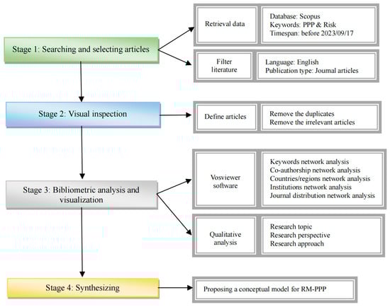 The intent of this study is to develop a conceptual model for RM-PPP. To ensure the results of this study are reliable and valid, a bibliometric analysis combined with science mapping was implemented as the foundation for visualizing the up-to-date knowledge on RM-PPP. By minimizing the subjectivity often associated with such studies, bibliometric analysis offers an objective and quantitative examination of bibliographic material, making it a valuable tool for organizing information within a specific field [30,31]. Science mapping functions as a bibliometric method for examining and extracting insights from scientific output [32]. The framework of this study is illustrated in Figure 1, and the overall flow is divided into four distinct stages.