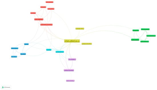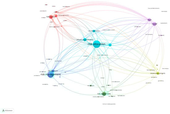 Keywords serve as fundamental elements of a paper, offering a concise representation of the topic within the literature [3]. Analyzing frequently occurring keywords is a common method for identifying trending themes within a research domain [40]. A cluster of keywords provides insight into the knowledge landscape by illustrating patterns, connections, and the intellectual structure of the research field. In this study, 416 articles published between 1990 and 2023 were analyzed, resulting in a total of 1510 extracted keywords. Among these, 96 keywords had a frequency greater than five. Common keywords such as “public-private partnership”, “PPP”, “project”, and “BOT” were excluded from the analysis as they represent core themes and are not the focus of this study. Additionally, keywords with similar meanings, such as “risk” and “risk factors” or “fuzzy set” and “fuzzy set theory” were consolidated. Keywords unrelated to the subject matter, such as “article” and “selection”, were also removed. After these adjustments, 61 high-frequency keywords remained. The network of co-occurring keywords was visualized using VOSviewer software, as illustrated in Figure 3. Based on the analysis, these 61 keywords were grouped into six clusters.