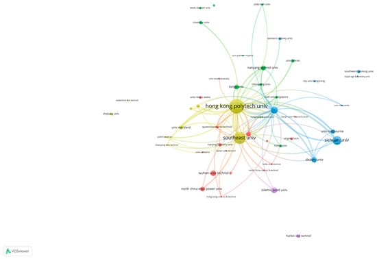 This section focuses on identifying the contributions of various affiliations in PPP risk management. The VOSviewer software was employed for scientific mapping. By establishing a minimum threshold of three papers per organization and a minimum citation count of 30, a total of 50 out of 508 affiliations met these criteria. Figure 6 illustrates the contributions and collaborations of research institutions related to RM-PPP. The associated information, including affiliation, country or region, total link strength, number of papers, and total and average citations for the top 20 most productive organizations, is summarized in Table 3.