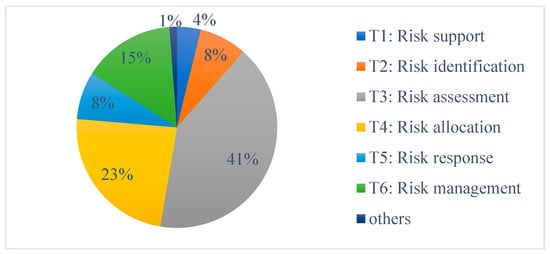Figure 8 summarizes the primary research topic in Public–Private Partnership (PPP) risk management. It can be inferred that the research theme predominantly focuses on risk assessment, which constitutes 41.12% of the selected literature sample. However, there has been comparatively less attention given to the aspects of risk response. Seminal works on risk response, which aim to enhance the effectiveness of PPP risk management, should be addressed.