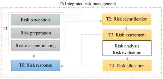 Based on the principles of risk management in PPP, the relationship between the six topics described in Figure 9 is crucial. Topic 1 serves as a foundational element for the entire risk management process. Topic 2 lays the groundwork for Topic 3, which involves the assessment of identified risks. This assessment leads to the reasonable allocation of risks between the public and private sectors according to established criteria. Finally, effective measures are implemented to respond to the identified risks.