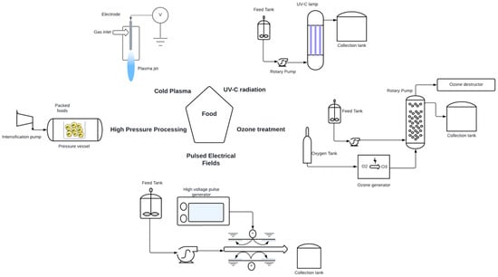 Overview of innovative food preservation technologies: diagram illustrating the different methods of food preservation, including cold plasma, UVC radiation, ozone treatment, high-pressure processing, and pulsed electrical fields, highlighting their respective processes and equipment setups used to inactivate microorganisms and extend the shelf life of food products.