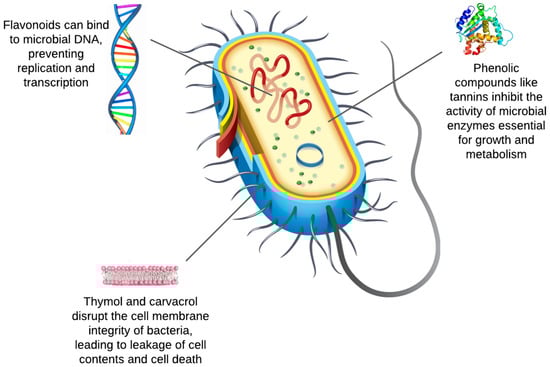 The mechanisms by which plant extracts preserve food primarily involve antimicrobial and antioxidant actions [148]. Antimicrobial activity is achieved through several mechanisms, including disrupting microbial cell membranes, inhibiting microbial enzyme activity, and interfering with microbial DNA synthesis [149]. For instance, essential oils such as thymol and carvacrol disrupt the cell membrane integrity of bacteria, leading to leakage of the cell contents and cell death [150,151]. Phenolic compounds like tannins inhibit the activity of microbial enzymes essential for growth and metabolism [152], while flavonoids can bind to microbial DNA, preventing replication and transcription [146]. Antioxidant activity of plant extracts is attributed to their ability to scavenge free radicals, chelate metal ions, and inhibit lipid peroxidation [153,154]. These actions prevent the oxidative degradation of food components, thereby preserving the nutritional quality and sensory attributes of food products. For example, rosmarinic acid and resveratrol neutralize free radicals and stabilize cell membranes, which helps maintain freshness and extend the food’s shelf life [155]. Figure 2 schematizes the effect of different compounds on the bacteria.