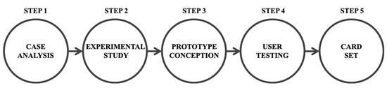 To facilitate the design of individual sustainable diet plans, the study progressed by developing a card set through five steps (Figure 1). First, a case study was conducted on the Michelin Green Star restaurants to analyze their implementation of sustainable concepts and consumer recognition, and based on dining experience, sustainable categories were identified that bridge the perspectives of consumers and producers. Second, utilizing emotional design principles, the sustainable themes from the previous step were classified into three distinct emotional levels. Variables influencing dietary choices were analyzed through experimental study. Third, a card prototype was designed based on the findings of the preceding steps. Fourth, the prototype of the card set was tested, and users were invited to share their experiences in using the cards, providing valuable optimization suggestions. Fifth, by integrating the improvement suggestions, the definitive “Sustainable Diet 3P Emotional Design Method” card set was developed. Next, the implementation process of each step is described.