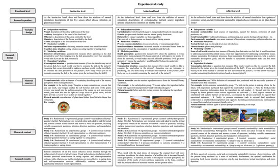 Currently, the implementation of emotional design in diet incorporates the utilization of aesthetics in food styling to heighten the appeal of food at the instinctive level [18], and employs default options or quantities to elevate the likelihood of particular food choices at the behavioral level [19], as well as considering intrinsic motivation and self-reflection in making diverse food choices at the reflective level [20]. However, current research lacks an integrated approach that considers promoting sustainable diet from three emotional levels, particularly the impact on distinct emotional levels under mental simulation conditions. In the context of imagination, pre-decision mental simulations have been suggested as being pivotal to diet decision shifts [21].