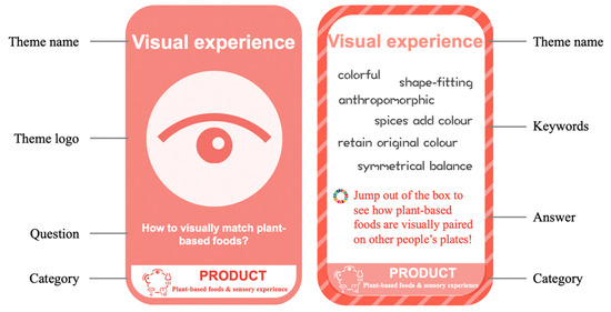 The third step involves designing the prototype of the card set, which corresponds to the outcomes of the first and second steps, and developing the thematic content of each card. According to the emotional design level, the card is divided into three parts, with five themes proposed for each part. The content design incorporates elements such as color, format, logo, and questions. Incorporating the definition of emotional design and considering the design content of experimental materials is the second step. At the instinctive level, the “product” content was designed to harness the sensory stimuli afforded by plant-based foods. At the behavioral level, the “promotional” content was designed to leverage the conclusions pertaining to the health benefits of nutritional elements. At the reflective level, the “benefit” content was designed to utilize the self-worth stimulus of sustainable content. For each theme, a logo was designed to visually represent and identify the concept [39].