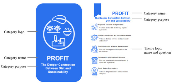 In addition to making modifications to address this content, the final version has undergone a more rigorous format review, refining any awkward or unclear statements. The final card set comprises 20 cards, encompassing a cover card (the front is “Plant-based Sustainable Diet 3P Emotional Design Method”; the reverse is the purpose of the card design), a definition card (the front is “Instructions for Use”; the reverse introduces the definition, the three levels of emotional design, and how to use the card), and 3 catalog cards (the front is the category logo and name; the reverse is the category theme logo, keywords, and inspirational questions, as shown in Figure 4), as well as 15 theme cards. The enhanced cards have been recognized and familiarized to all users tested, and everyone expressed a desire to utilize the card set for longer-term sustainable diet plans.