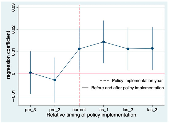 When using a differential model to evaluate the policy effect, ensuring the establishment of the parallel trend hypothesis is essential to guarantee the effectiveness of the model. In view of this, this study adopts the rigorous strategy of event study to analyze the dynamic effects of zero-waste city pilot policies over time [30]. The model is established as shown in Equation (2):