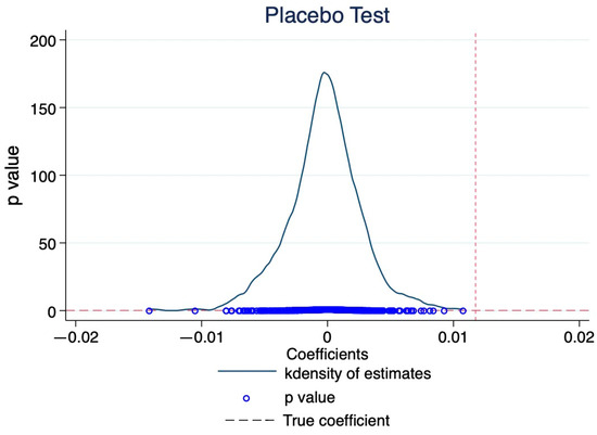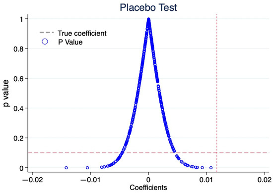 After the parallel trend test of the multistage difference model, we further examined whether the two groups were potentially disturbed by external policies or random factors in the post-intervention period. To test for this possibility, we used 500 random samples. By randomly generating a pseudo-experimental group and pseudo-policy dummy variables for the placebo test, 500 groups of regression coefficients were finally obtained, and placebo test diagrams, as shown in Figure 3 and Figure 4, were drawn. Figure 3 shows that, after randomization, the coefficient is close to 0, and the p-value is essentially above 0.1. The estimation results of the actual observed sample data, represented by the vertical dashed line, deviate from the main distribution range of the random sample’s estimated coefficients. This indicates that the random sample estimation results are not significant and that there is a large difference compared to the real sample estimation results, signifying that the model has successfully passed the placebo test, excluding the influence of other policy or random factors.