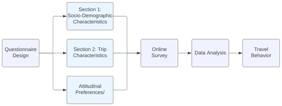 Figure 3 illustrates the process of data collection and analysis employed in the study. A comprehensive travel survey was conducted among the target population, including students, employees, and academic staff, in order to gather detailed information on travelers’ trips to, within, and departing from the Beirut and Debbieh campuses of BAU. For this reason, during the 2023–2024 academic year, a thoroughly designed survey was distributed online to individuals commuting to both campuses between the fall and spring semesters.