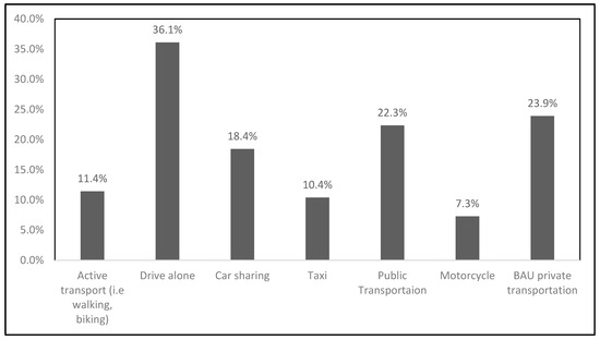 Figure 6 shows the distribution of travel modes among BAU users. The most common mode is driving alone, with 36% of the respondents choosing this option. This is significantly lower than the 96% reported by a previous study conducted by Abou Ali et al. on student travel behavior [33]. Carpooling is the second most popular mode, with 18.4% of the respondents sharing their rides. About a quarter of the respondents (23.9%) use the BAU bus service, which is a paid service for students and staff. Public transportation and taxis are also used by some respondents, with 22.3% and 10.4%, respectively. Active transport, such as walking or cycling, is another mode that is rarely used, with only 11% of the respondents opting for it. Travel by motorcycle is the least common mode, with just 7.3% of the respondents utilizing it in their journey to campus.
