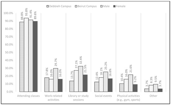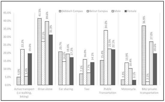 Figure 7 compares the mode choices of the respondents from both campuses and genders. The most popular mode for Debbieh campus respondents was driving alone (41.5%), followed by the BAU bus service (36.9%). Car sharing was the third most common mode (20.7%), which is more sustainable than driving alone. On the other hand, the most popular mode for Beirut campus respondents was public transport (34.0%), followed by driving alone (27.1%) and active transport (22.2%), such as walking or cycling. The difference between the two campuses can be attributed to the area classification: the Debbieh campus is in a rural area, while Beirut campus is in an urban area with better pedestrian and public transport access.