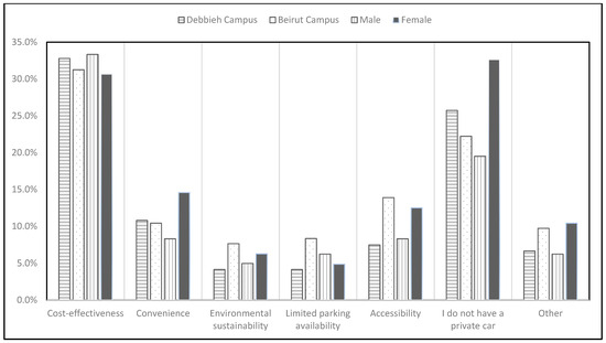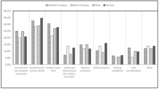 One of the questions asked the respondents who used private cars to travel to BAU about the reason(s) behind their choice. The most common reason was the availability of a private car, chosen by 31.2% of the respondents. The second most common reason was shorter travel time, chosen by 27.3% of the respondents. Similarly, Al-Shaar et al. found that time was a prevailing factor in the choice of private car among the general Lebanese population [34]. Meanwhile, the third most common reason was the inconvenient schedule of the bus, chosen by 23.1% of the respondents. Other reasons included weather conditions (13.8%), safety concerns (11.7%), cost considerations (10.4%), inadequate bus infrastructure (10.2%), and parking availability (6.2%). Some respondents chose more than one reason, so the percentages add up to more than 100%. Figure 9 shows the distribution of the reasons by campus and gender. There were some differences between the campuses and genders in the reasons. For example, Debbieh campus respondents were more likely to choose shorter travel time than Beirut campus respondents, while Beirut campus respondents were more likely to choose inadequate bus infrastructure than Debbieh campus respondents. Female respondents were more likely to choose safety concerns and taxis than male respondents, while male respondents were more likely to choose the BAU bus service and motorcycles than female respondents.