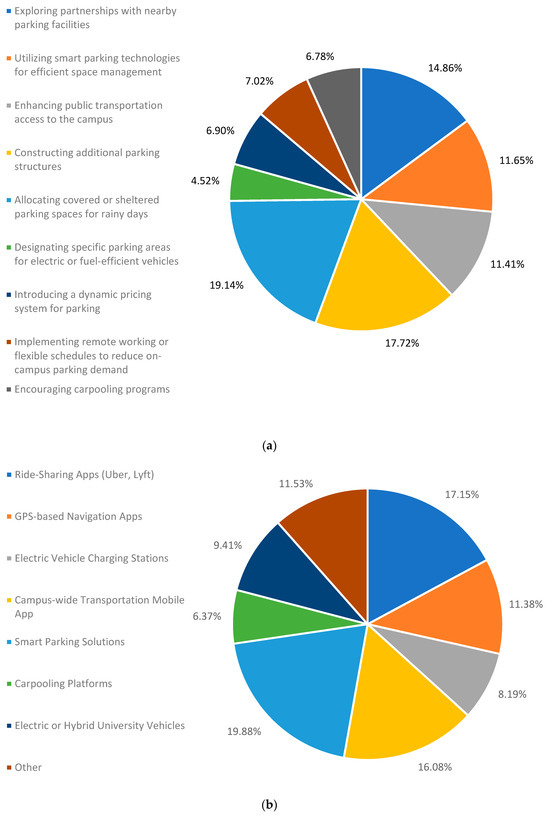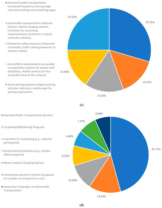 The final recommendations are to introduce ride-sharing platforms, as suggested in Figure 12b and Figure 12d, respectively, and efficient parking systems, as the respondents show a preference for in Figure 12b and Figure 12c, respectively. Partnerships with local businesses could promote ride-sharing platforms by offering discounts or incentives for employees who carpool. Efficient parking systems could reduce the number of solo drivers and the demand for parking spaces. Pilot programs could be launched to test the effectiveness of these initiatives.