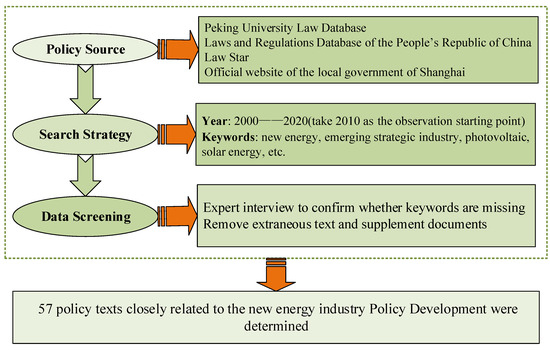 In the history of China’s new energy industrial development, 2010 is a landmark year. That year, the Emerging Energy Industry Development Plan from 2011 to 2020 was formulated by the China National Energy Administration, which was the first national strategic plan for large-scale development of the new energy industry over the past decade. Meanwhile, the Notice on Carrying out Subsidy Pilots for the Private Purchase of New Energy Vehicles was jointly issued by various ministries of the government in 2010, which launched a subsidy pilot for the private purchase of new energy vehicles in cities such as Shanghai, Hangzhou, Hefei, Shenzhen, and other cities. These policies not only marked the formal establishment of Shanghai’s new energy industrialization policy objectives, but a large number of related supporting policies were also introduced and rapidly developed in the following year. From the perspective of policy changes, this stage shows obvious policy breakpoint characteristics, providing a clear time division node for counterfactual inference. Therefore, we take 2010 as the observation starting point, use keywords such as new energy, emerging strategic industry, photovoltaic, solar energy, etc., and collect relevant policies, regulations, and normative documents from databases, such as the Peking University Law Database, Laws and Regulations Database of the People’s Republic of China, Law Star, and the official website of the local government of Shanghai. After initially collecting 143 policy texts, through careful review and screening, duplicate and non-related texts were excluded, and finally, 57 policy texts closely related to the new energy industry policy were determined, providing a basis for further research. Figure 2 shows the process of NEIPP text collection.
