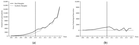 Impact of the NEIPP on the real Shanghai’s technological innovation in contrast with the synthetic Shanghai: (a) Comparison of green technology innovation between real Shanghai and synthetic Shanghai: (b) Mean value gap between real Shanghai and synthetic Shanghai in green technology innovation.