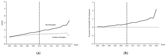 Impact of the NEIPP on the real Shanghai’s eEconomic sSustainable dDevelopment in contrast with the synthetic Shanghai: (a) Comparison of economic sustainable development between real Shanghai and synthetic Shanghai; (b) Mean value gap between real Shanghai and synthetic Shanghai in economic sustainable development.