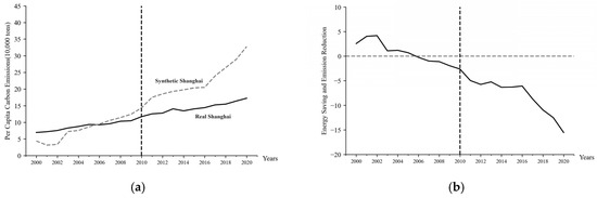 Impact of the NEIPP on the real Shanghai’s eEnergy sSaving and eEmission rReduction in contrast with the synthetic Shanghai: (a) Comparison of energy saving and emission reduction between real Shanghai and synthetic Shanghai; (b) Mean value gap between real Shanghai and synthetic Shanghai in energy saving and emission reduction.