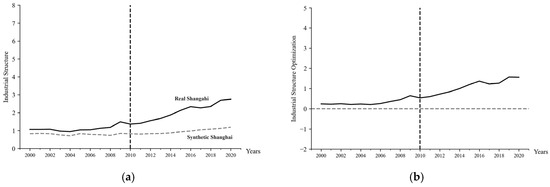 Impact of the NEIPP on the real Shanghai’s Industrial Structure Optimization in contrast with the synthetic Shanghai: (a) Comparison of industrial structure optimization between real Shanghai and synthetic Shanghai; (b) Mean value gap between real Shanghai and synthetic Shanghai in industrial structure organization.