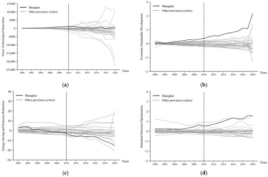 Although after considering the estimated bias probably caused by sample self-section and endogenous problems, we have chosen the SCM method to obtain an accurate estimated result. This paper further introduces the method of Abadie et al. (2010) to further verify the robustness of the policy evaluation results [45]. The basic idea of this method is to assume that all control group provinces implement the new energy industrial policy with Shanghai in the same year and then use the SCM to construct a synthetic control unit for each control group province, calculating the difference between the synthetic control unit and the actual province as the effect of the hypothetical policy. Then, from the goal dimensions of optimizing the industrial structure, promoting sustainable development, promoting technological innovation, and energy saving and emission reduction, we compare the actual policy effects of Shanghai and the hypothetical policy effects of the control group provinces. If, on a certain goal dimension, the actual effect of Shanghai is significantly higher than the hypothetical effect of the control group, it indicates that the implementation of the new energy industry policy in Shanghai is effective on this goal dimension, and the conclusion is robust. Conversely, if on a certain goal dimension, the difference in effects between the two is not significant, or the actual effect of Shanghai is lower than the hypothetical effect of the control group, there are two possibilities: first, the implementation of the new energy industry policy is ineffective in this goal dimension, and the conclusion is robust; second, Shanghai’s new energy industry policy is effective in this goal dimension, but the conclusion is not robust.