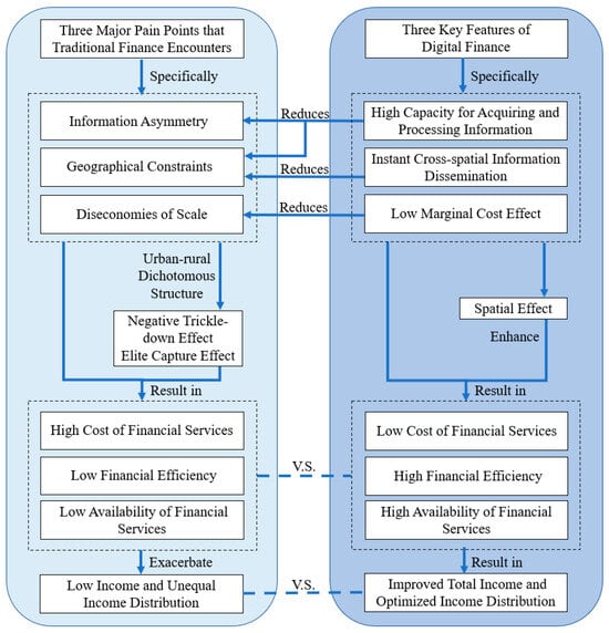 Furthermore, the negative trickle-down effect and elite capture effect exacerbate these three pain points for traditional financial services. First, a negative trickle-down effect is often observed between urban and rural areas because the financial infrastructure in rural areas is far less developed than in urban areas []. Hence, residents in urban areas (or economically developed areas) and large- and medium-sized enterprises obtain access to increasing financial resources, while the financial resources of rural residents and MSMEs are gradually encroached upon. Second, similar to the negative trickle-down effect, residents in rural areas are often affected by the elite capture effect. The elite capture effect refers to the phenomenon in which elite farmers with certain power and relationship advantages in rural areas have more chances to access financial resources such as agricultural loans [] and even tend to occupy the resources for themselves, which makes it more difficult for poor farmers to obtain financial services. Both the negative trickle-down effect and the elite capture effect lead to lower levels of financial accessibility, lower levels of financial efficiency, and higher costs for long-tail users. As a result, these long-tail users are not able to fulfill their own financial needs and improve their income.