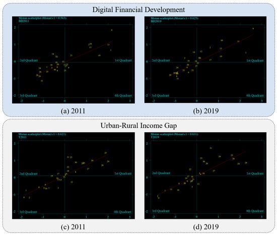 As pre-tests for the exploration of Hypothesis 2 (H2), this study first performs a global and a local spatial correlation test to explore the spatial distribution of digital financial development and the urban-rural income gap. As for the global spatial correlation test, Table 7 presents the global Moran’s I values of digital financial development and the urban-rural income gap (measured by the Theil index) for 31 Chinese provinces from 2011 to 2019. It can be seen that at the 1% significance level, both the digital financial development and urban-rural income gap in China have significant positive spatial correlations, affirming that both of them have the characteristics of positive spatial correlation. To put it another way, regions with better digital financial development or a greater urban-rural income gap are close to one another, and vice versa. It is noteworthy that, as time goes by, the coefficient of global Moran’s I in terms of digital financial development increases gradually from 0.563 to 0.625, and that of the urban-rural income gap increases from 0.621 to 0.631. In this regard, it becomes more evident that digital financial development as well as the urban-rural income gap are spatially clustered. It lends credence to the adage “birds of a feather flock together”.