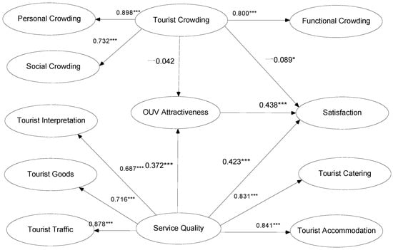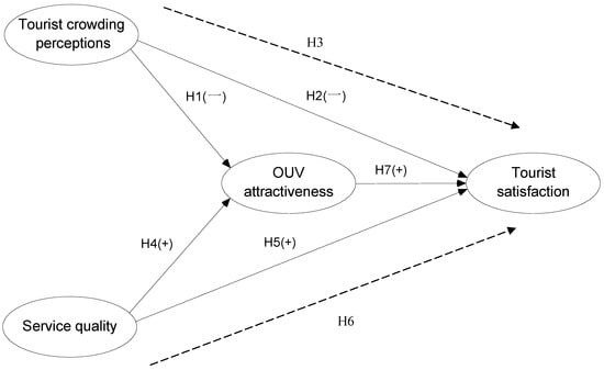 It can be said that well-developed WHS often face challenges such as overcrowding, capacity overload, inadequate tourism facilities, and excessive commercialization, which pose significant issues to the protection of OUV and WHS [5,6,7]. In particular, overcrowding and over-tourism at WHS have seriously affected the features of tourism experience and satisfaction, reducing OUV attractiveness and hindering the healthy development of WHS tourism [8,9,10]. As an important stakeholder in the tourism activities of WHS, tourists’ attitudes, behaviors, and quality of experience have a significant impact on WHS’ protection and sustainable development. Tourists are not only participants and contributors to heritage conservation, but also supervisors and beneficiaries. Therefore, it is of great value to study tourists’ perception of tourism crowding, service quality, destination attractiveness, and overall satisfaction. This is the starting point and focus of this study.