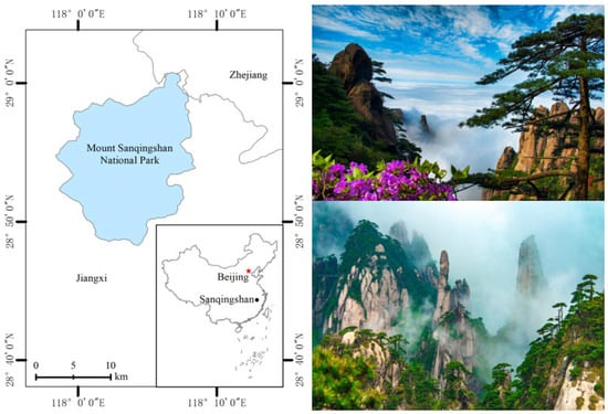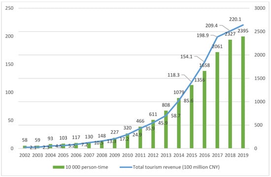 The Mount Sanqingshan National Park (MSNP) is located in Jiangxi Province, China. Its entire region is 229.5 square kilometers, and the maximum length is 1819.9 m. It combines national scenic spots, world natural heritage sites, world geological parks, and top national tourist attractions (Figure 2). It is named after the towering peaks of Yujing, Yuxu, and Yuhua, which resemble Taoism’s three supreme deities, Yuqing, Shangqing, and Taiqing, a famous Taoist mountain that has been culturally infiltrated for thousands of years. In particular, the MSNP was listed as a WHS by UNESCO (United Nations Educational, Scientific and Cultural Organization), which has attracted more attention at home and abroad. The UNESCO World Heritage Committee believes that the MSNP is of OUV. It displays unique granite pillars and peaks. The combination of lifelike granite shaped stones, rich ecological vegetation, and the wonders of climate change in the near and far create a unique landscape in the world, presenting fascinating natural beauty. “揽胜遍五岳, 绝景在三清” (“When we visited the most famous mountains in China such as Mount Taishan, Huashan and so on, we found the most beautiful scenery in MSNP”), said Shi Su, who was one of the most famous poets of the Song Dynasty (960–1279) in China. Since the onset of the 21st century, the tourism industry has experienced rapid expansion, attracting a substantial influx of domestic and international visitors, and generating significant economic benefits. By 2023, the number of tourists and tourist revenue of MSNP had skyrocketed to 28.98 million and 26.62 billion CNR (CNR, Chinese Yuan), respectively (Figure 3). At the same time, this brought enormous pressure to the WHS’ protection and forest ecosystem overload, unavoidably leading to issues of overcrowding and excessive tourism, and also placing higher demands on tourism service quality. This may have had a certain impact on the attractiveness of OUV and tourist satisfaction, as well as posing challenges to the sustainable development of WHS; selecting the MSNP as a case study is, therefore, acceptable and appropriate.