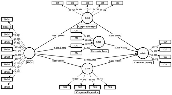 A favorable image is integral to the success of banking institutions, as it significantly impacts customer perceptions and behaviors. To better comprehend the interplay between a bank’s image and its implementation of the SDGs, CL plays a pivotal role in understanding how sustainability practices influence customer relationships. One exciting aspect to investigate is the mediating effect of a favorable image on the relationship between SDG implementation and CL. When potential customers evaluate banks, the image of the institution significantly influences their decision-making process [106]. Encouraging banks to cultivate a healthy corporate image is a significant incentive, as it can deeply impact customer behavior. An image’s positive influence extends to consumer behavior and overall positive bias. Specifically, a favorable image is positively associated with customer satisfaction [107,108] and loyalty [109]. Notably, sustainability management practices adopted by the banking sector appear to enhance their overall image [10].