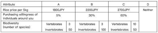 We applied a discrete choice experiment using an orthogonal array in Step 4 of our survey questionnaire. Our design was implemented by using AlgDesign package in R. The choice set comprised three alternatives, each characterized by three attributes: rice price (four levels—JPY 1800, JPY 2200, JPY 2700, and JPY 3200 per 5 kg, based on retail prices from rice stores in Japan), individuals’ purchasing willingness within their social circles (four levels—5%, 30%, 60%, and 90%), and the degree of biodiversity in the eco-friendly rice paddies, as depicted in Figure 1. We introduced the number of vertebrates and invertebrates that certain eco-rice host as key biodiversity indicators, the choice set of which is based on the findings presented in Figure S1. We classified amphibians we identified in rice paddies as vertebrates, and mollusks and arthropods as invertebrates. To assess their effects, two levels were assigned to the number of vertebrate species (3 and 10) and invertebrate species (50 and 100). Finally, we included a “no-purchase” option in each choice set to accommodate respondents who may choose not to make a purchase. To illustrate, in option A, the price of a certain eco-rice per 5 kg is JPY 1800, with 5% of people within the respondent’s social circle willing to purchase it, and this rice hosts 3 vertebrate species and 50 invertebrate species during its planting. If the respondent chooses none of options A, B, and C, he/she can choose option D. Each participant was asked to respond to nine choice sets.