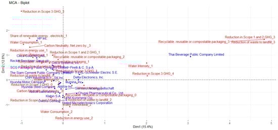 In Figure 1 we have the biplot, a graphical representation of the relationships between the factor space axes (represented in this case by the dimensions Dim1 and Dim2) and the variable categories (represented by the dots), which was generated by multiple correspondence analysis (MCA). The biplot captures the complex correlations in a dataset of corporate environmental sustainability indicators (for information on biplots see [47]).