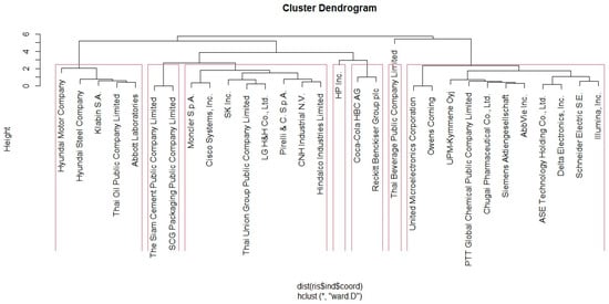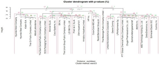 The dendrogram uses Euclidean distance to measure cluster dissimilarity, while Ward’s approach (ward.D) is used to reduce intra-cluster variation. The explanation of the hierarchical structure by PVClust suggests the existence of discrete groups with different degrees of similarity. Interestingly, AU values of 100% indicate that certain clusters—such as “Thai Beverage Public Company Limited” (Bangkok, Thailand) and “Reckitt Benckiser Group plc” (Slough, UK)—have strong data support. This high number indicates that the cluster is statistically significant and not due to chance.