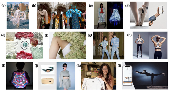 (a) Johanna Jaskowska showcased the virtual garment “Iridescence”; (b) Royal Academy of Fine Arts in Antwerp launched an online graduate design series; (c) A capsule collection of clothing co-created by Anna Yang and the AI of the Huawei P30 Pro; (d) “E-TRACE” ballet shoes and the Google x Levi’s smart jacket “Jacquard”; (e) Biodegradable fabrics developed by Scarlett Yang; (f) Alice Potts combined food with fabric to create a foldable design top; (g) Diesel implemented textile treatment technologies to inhibit viral activity; (h) Chromat developed self-adjusting lingerie; (i) The University of Tokyo created location-projected clothing; (j) Hussein Chalayan and Intel unveiled sunglasses for monitoring physiological indicators on the runway; (k) Rice University conducted research on smart wearables made from flexible carbon nanotube fibers; (l) Wearable X launched Nadi X.