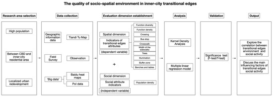 This study aims to develop a multidimensional framework for evaluating the quality of the socio-spatial environment of transitional edges, encompassing four key dimensions: connectivity, social function, comfort, and conviviality. Each dimension includes specific indicators that reflect different aspects of the socio-spatial environment. The data for these indicators were collected using a combination of open-source spatial data, Baidu heat maps, Points of Interest (PoI) data, and field surveys. These data were processed and analyzed using Geographic Information System (GIS) 10.2 software and statistical analysis tools. GIS-based spatial analysis methods, such as kernel density analysis and spatial join tools, were employed to quantify the density and distribution of each indicator, linking spatial attributes with street segments. Finally, a multiple linear regression model was applied to understand the impact of these indicators on social activities within transitional edges. The regression analysis aimed to identify significant predictors among the indicators, determining how each factor influences population density, which serves as a proxy for the intensity of social activities.