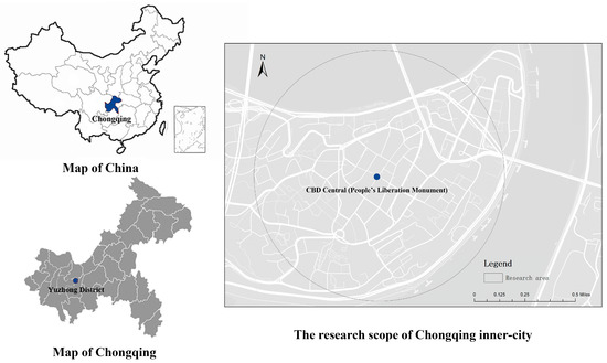 The study selected the area between the Jiefangbei CBD and inner-city residential areas in Chongqing’s Yuzhong District as the target area, as shown in Figure 2. In selecting the research area, researchers considered criteria such as the adjacency of the CBD to inner-city residential areas, population density, and the background of local urban redevelopment. After field surveys, Jiefangbei CBD was found to meet the study requirements. Jiefangbei CBD is located in Chongqing’s Yuzhong District, comprising the “core” area of Jiefangbei and the “periphery core” area of Chaotianmen, fulfilling both commercial and trade functions. The “core” area extends east from Xiaoshizi; west to Jintang Street; north to Cangbai Road, Linjiang Road, and Minsheng Road; and south to Heping Road and Xinhua Road, covering 0.92 square kilometers. The “periphery core” area of Chaotianmen covers 0.69 square kilometers. The total area of Jiefangbei CBD is 1.61 square kilometers, primarily covering the Jiefangbei Street area in Yuzhong District. In 2013, based on Chongqing’s economic development needs, the planned area of Jiefangbei CBD was expanded to 3.5 square kilometers. By 2020, the permanent population was 57,485. This area is the earliest developed CBD in Chongqing, with a complete road network and relatively high density.