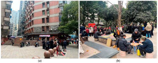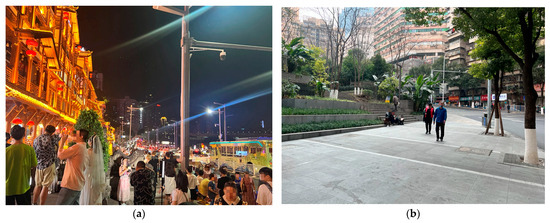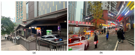 In addition, this area is particularly notable for its unique geographical location and functional zoning, making it an ideal site for studying urban transitional edges. The Jiefangbei CBD is not only a major commercial and trade center but also surrounded by inner-city residential areas that offer rich material for examining the diversity of socio-spatial environments. Specifically, the area implements diverse social activities (see Figure 3a,b). In contrast, the complex mountainous terrain (see Figure 4a,b) further provides opportunities to explore the socio-spatial dynamics of transitional edges in hillside cities.