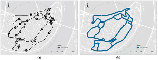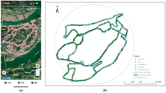 The research team obtained field survey data through direct observation and recording. This included the number and location of pedestrian crossings, street widths, street buffers, trees’ density, lighting, and furniture. During the survey, streets were numbered, photographed, and recorded, and the collected data were summarized into Excel spreadsheets and imported into ArcGIS 10.2 software to be converted into vector point features. This ensured that the natural spatial environment of the transitional edges was accurately captured and provided a reliable reference basis. The record is depicted in Figure 8a,b.