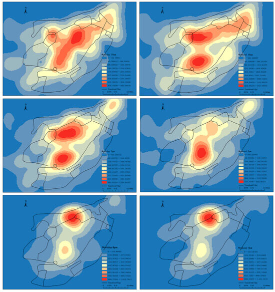 Baidu heat map data were acquired through the Baidu Huiyan API, covering the pedestrian heat data of Chongqing on weekdays and weekends. The data were collected at hourly intervals at 10 am, 5 pm, and 8 pm, serving as an important data source for evaluating the intensity and distribution of pedestrian social activities, as depicted in Figure 6.
