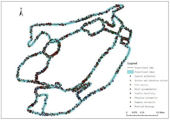 The degree of social function mixing is calculated using information entropy to measure the POI mix within different analytical units of transitional edges, as shown in Equation (3). The higher the mix degree, the more service facilities are provided within the transitional edge, meeting the needs of people with different travel purposes.