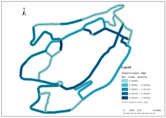 Transportation node density is the ratio of the number of various transportation facility nodes within different analytical units of transitional edges to the area of the analytical unit, as shown in Equations (4) and (5). The types of transportation nodes include external transportation nodes, such as bus stops, and internal transportation function nodes, such as intersection counts. To ensure that the number of transportation nodes is not affected by the scale of the analytical unit, the number of different types of transportation nodes is normalized. The higher the transportation node density, the stronger the internal and external accessibility of the transitional edge, which is more conducive to internal transit for residents and the connectivity between the CBD and inner-city residential areas.