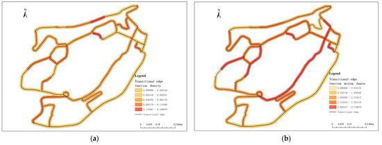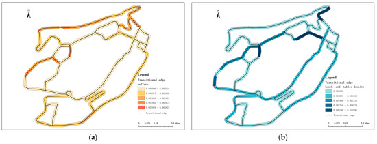 The spatial distribution of street buffers (Figure 14a) indicates that streets with these features are primarily located in the peripheral areas of the transitional edges, close to inner-city residential zones, reflecting local pedestrian flow patterns. Notably, streets such as Xinhua Road and Linjiang Road, which lack buffer zones, often serve as major traffic corridors with high flow rates, highlighting a trade-off between traffic efficiency and the provision of social spaces.