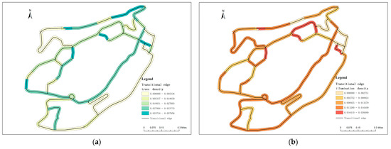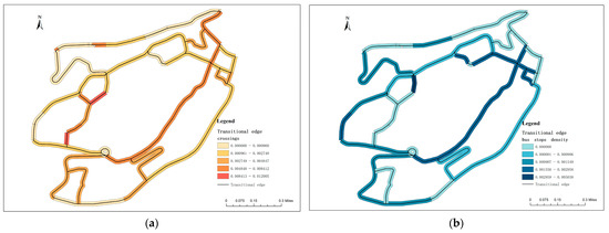 Based on Baidu panoramic maps and field survey data, the crossing and bus stop density within the transitional edges was categorized into five natural breaks (see Figure 11a,b). GIS visual analysis shows that areas like Xinhua Road have high crossing and bus stop densities, indicating greater accessibility. High-density areas, such as Panjia Lane and Datong Road, are typically located near well-established, older residential neighborhoods with a high population density and vibrant commercial activities. This density facilitates pedestrian movement, reduces reliance on private vehicles, enhances social interaction, and integrates different urban functions. The study also highlights that, unlike typical urban streets, the transitional edges in Chongqing feature specific routes characteristic of a hillside city. For instance, Beiqu Road is positioned alongside a hill. At the same time, Jialing River Riverside Road runs along the river, limiting pedestrian activity to one side of the street with minimal need for crossing. These unique pathways significantly influence pedestrian movement and accessibility, which are crucial for enhancing the radiative effect of the CBD.