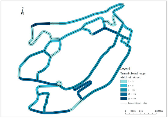 Street width is used as a comfort indicator, as it may affect the environmental rating of transitional edges. During field surveys, the width of each street was recorded and classified into five levels. The collected street width level data were imported into ArcGIS software and converted into vector point features. The street width level features were linked to each street using spatial join tools to obtain environmental data with street width level attributes.