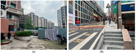 Based on the existing results, the comfort of transitional edge areas near residential zones is particularly crucial. Despite the study area being positioned in a highly socially active urban core, municipal authorities have provided relatively complete street environments, such as lighting and greenery. However, the comfort of certain streets still needs to be improved, revealing significant issues in resource allocation (see Figure 16a). Additionally, the limitations in developing transitional edge streets may stem from Chongqing’s unique mountainous spatial characteristics and the diverse social needs of users. Especially under complex terrain conditions and dynamic changes in various social demands, transitional edges’ spatial layout and functional arrangement face significant challenges (see Figure 16b). These factors present conflicts and challenges for design practices and policy-making, leading to notable deficiencies in the functionality of some streets.